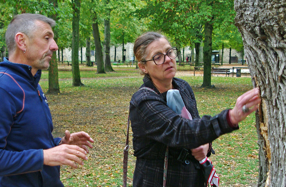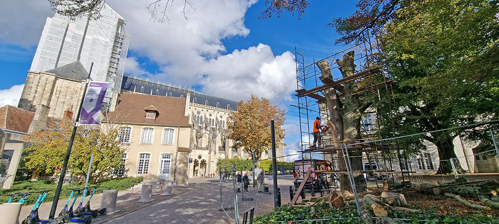 Scènes inhabituelles, Square du Cardinal Lefebvre, où le hasard du calendrier vient faire coexister la mise en place d’un massif de Chrysanthèmes avec la transformation de deux arbres en sculptures ; celle d’un Hêtre mort, place du Cardinal Joseph Lefebvre et non loin, dans le jardin de l’Hôtel de Ville d’un Érable.